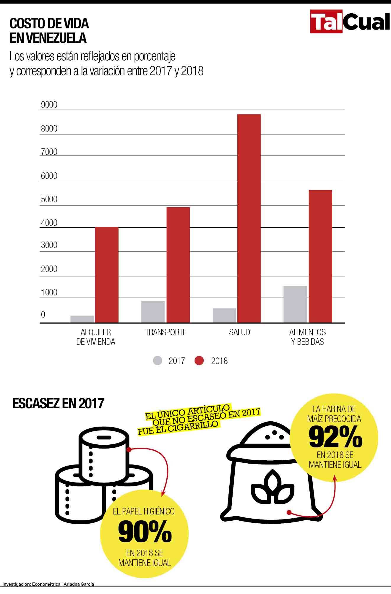 El alquiler de vivienda pasó de 142% en 2017 y a 3.962% en 2018, mientras que el transporte pasó de 800% en 2017 a 4.868% en 2018. El aumento en el sector salud se ubicó en 8.800% este año, mientras que en 2017 fue de 600%.