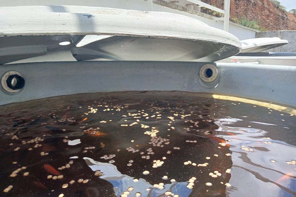 Contenedor de peces de tamaño mediano con alimento para peces. Fotografía: Adriana Materano