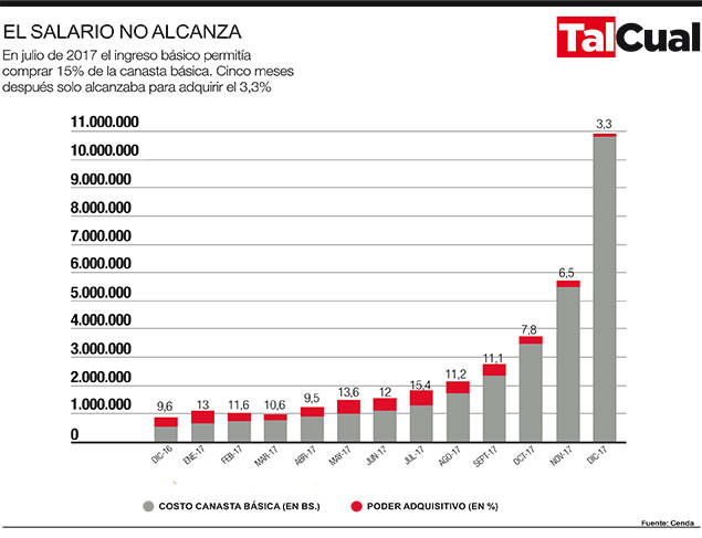 La canasta básica de alimentos, bienes y servicios alcanzó en diciembre de 2017 los 10 millones 808.528 bolívares, presentando una variación intermensual de 96,8% (Bs. 5,31 millones), la más alta registrada en los últimos 20 años, según el Centro de Documentación y Análisis de los Trabajadores (Cenda).