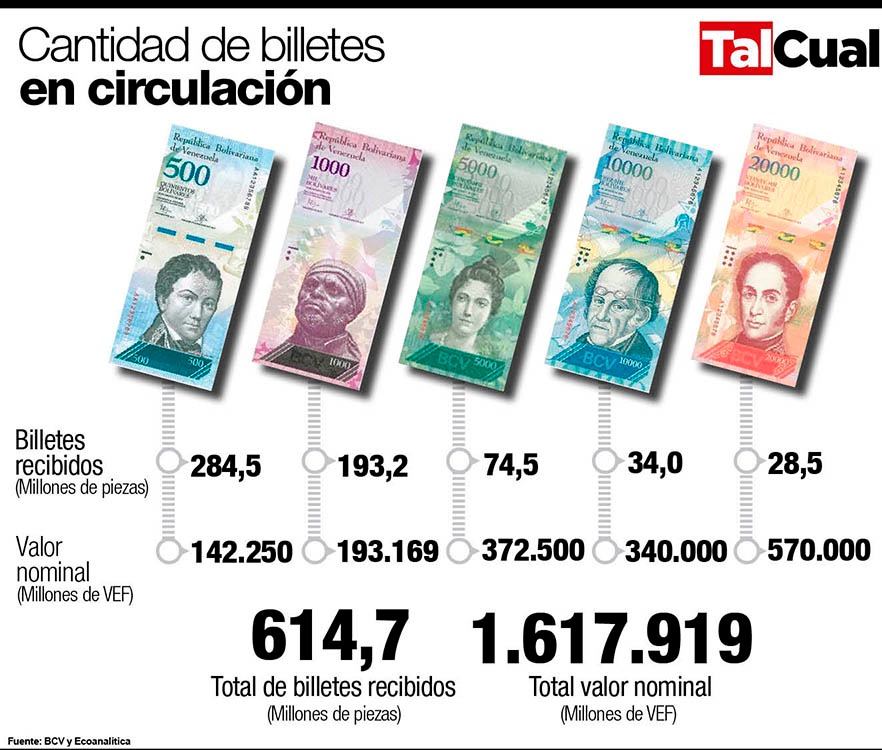 Tomando este rango, se puede estimar entre 30 millones y 73 millones de dólares el gasto en importación de nuevos billetes. Aunque es de resaltar que estos fueron solo una parte de los 1.776 millones de billetes que fueron puestos en circulación hasta noviembre de 2017, el último mes con datos disponibles.