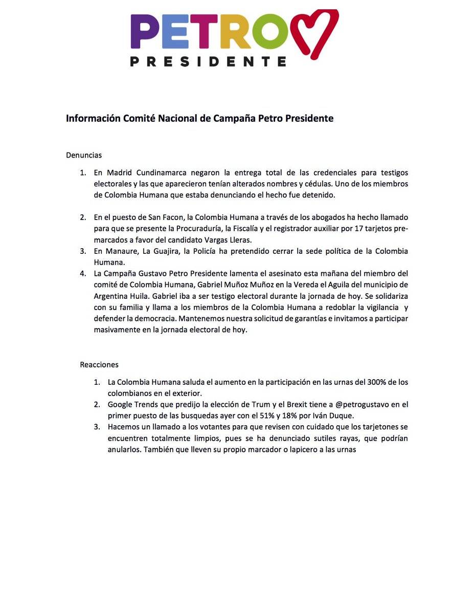 El comité de campaña del candidato a la Presidencia de Colombia, Gustavo Petro, emitió un comunicado la tarde de este domingo en el que expone varias irregularidades que presuntamente habían ocurrido durante la jornada electoral.