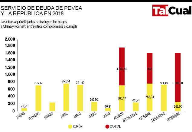 En 2018 el panorama con el pago de la deuda es malo o muy malo. Los analistas señalan que el cambio positivo de los escenarios pasa por China. Si el gobierno asiático prorroga el período de gracia de dos años que concedió a la administración Maduro en su más reciente acuerdo de endeudamiento, el país solo deberá desembolsar 1.169 millones de dólares, pero si no hay prórroga el servicio con los chinos se elevaría a 6.403 millones de dólares.