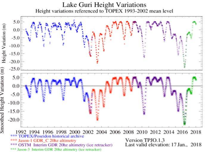 Según cifras detalladas del Departamento de Agricultura de Estados Unidos para servicios extranjeros, se evidencia que durante 2016 se registró el pico más bajo en la altura de la represa del Guri desde 1992, al marcar menos de 20 metros de la cota 0. Sin embargo, en 2017 y 2018 las precipitaciones ayudaron en gran medida a incrementar el nivel de altura del agua en el embalse, para situarse el 17 de enero de 2018 en cinco metros por encima de lo que se requiere para funcionar (Para ver el grafico pulse aquí )