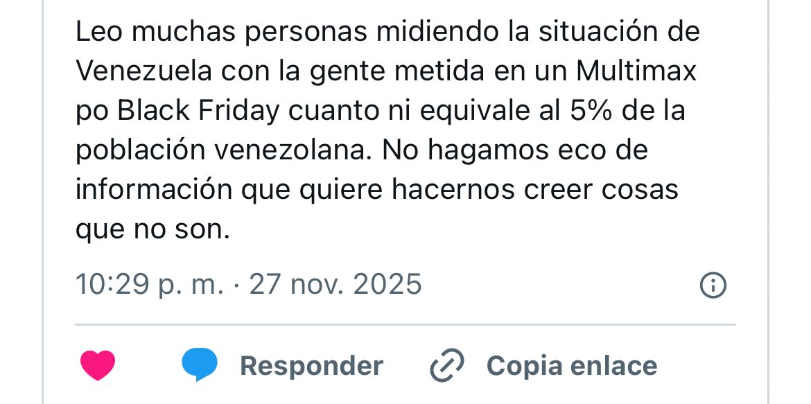 Mientras algunos celebran las rebajas, otros juzgan la jornada como una “burbuja comercial”, que no refleja la crisis económica del país. Venezuela enfrenta una inflación proyectada sobre el 500%, una devaluación acelerada y tensiones geopolíticas en el Caribe. El fenómeno desató un intenso debate público. En redes sociales, varios usuarios criticaron que la concurrencia en ciertas tiendas se presentara como reflejo de la situación económica del país, y cuestionan que las imágenes de multitudes comprando sean usadas como símbolo de recuperación, cuando muchos apenas logran cubrir necesidades básicas.