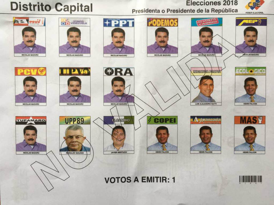 Lo primero que podemos observar es que en 10 tarjetas aparece la efigie de Maduro, quien está apoyado además del PSUV por los partidos Somos Venezuela (que antes era el NCR, de Luis Tascón. De esta organización se dijo que no era un partido político en un principio) , PPT, Podemos, Alianza por el Cambio (Esta organización, fundada por Ricardo Sánchez, provino luego de que el político y exlíder estudiantil -suplente de María Corina Machado en la Asamblea Nacional- saltara la talanquera y se ligara al oficialismo), MEP, PCV, UPV, Tupamaro y ORA, invadiendo casi todo el tarjetón.