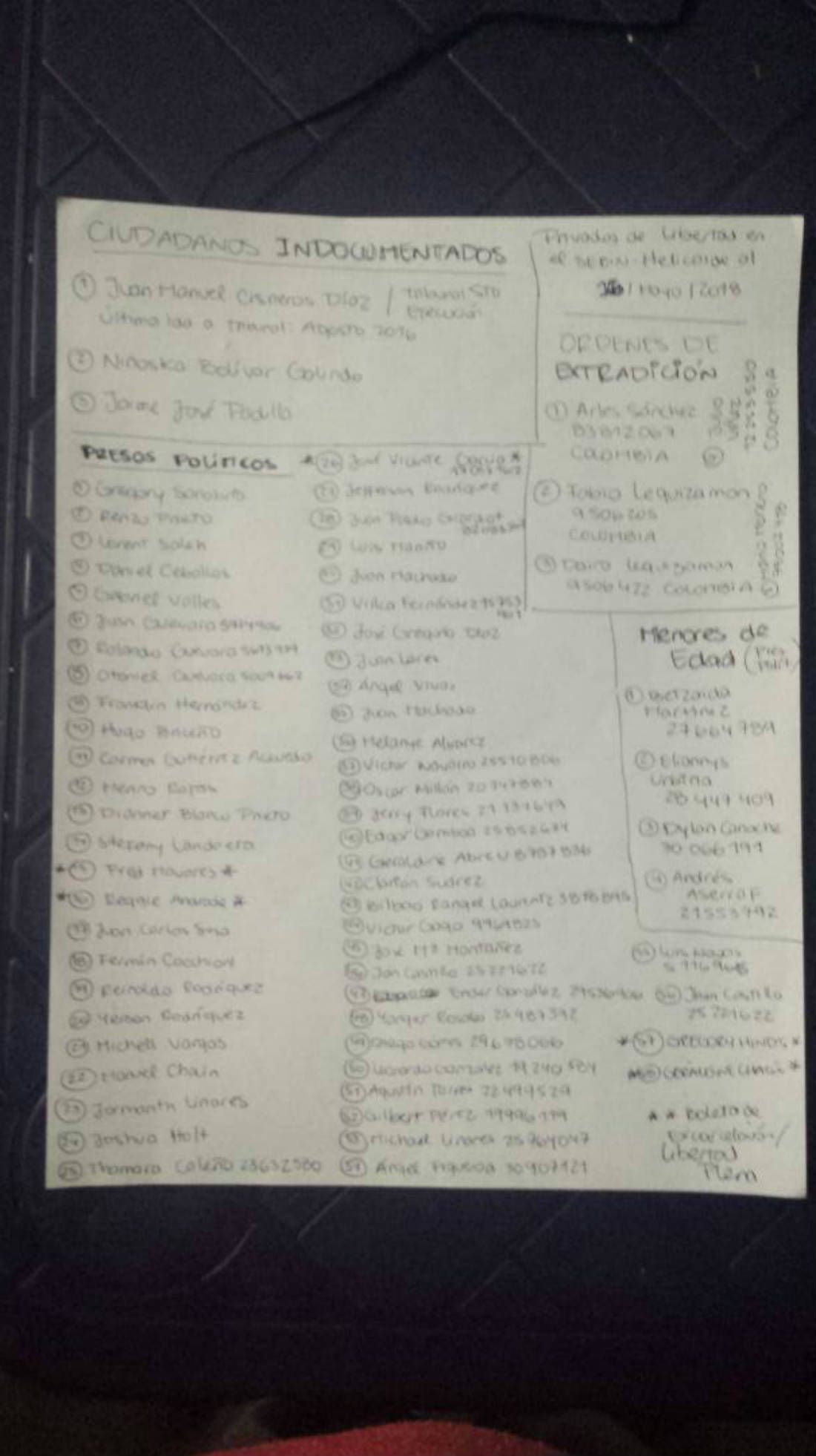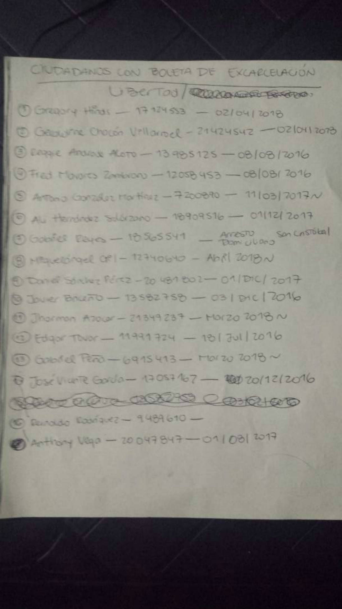 Nombres como Gregory Sanabria, Renzo Prieto, Ángel Vivas, Lorent Saleh, Daniel Ceballos, Eduardo y Otoniel Guevara, destacan en la hoja escrita a mano que salió a la luz pública.
