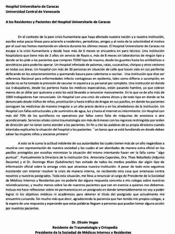 El residente de Traumatología y Ortopedia del Hospital Universitario de Caracas, Efraím Vegas, hizo pública su carta de renuncia a la institución, donde devela la profunda crisis que mantiene desde hace seis meses al nosocomio en paro técnico.