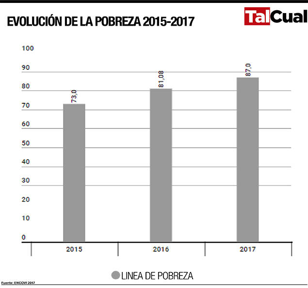 Así lo revelan los datos de la Encuesta de Condiciones de Vida (Encovi) 2017, que recuerda que para 2014 la pobreza se ubicaba en 48,8%, cifra que subió a 51,51% en 2016.
