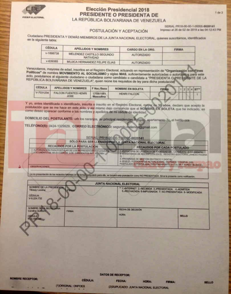 En el sistema del Consejo Nacional Electoral, ya figura la inscripción del exgobernador de Lara Henri Falcón como candidato por parte de los partidos Movimiento al Socialismo (MAS) y Avanzada Progresista (AP), a los comicios presidenciales.