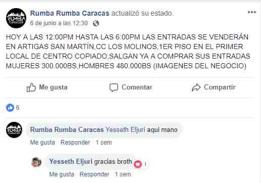 Las convocatorias se difunden a través de redes sociales. Los jóvenes ofrecen las entradas bajo un sistema de preventa y como parte de la promoción se especifica el pago de una especie de multa que permite el ingreso a menores de edad: “menores de 18 años pagan una multa de 60.000 bolívares”, mientras que la entrada de menores de 15 años también se resolvía con pagar una multa de 120.000 bolívares (el costo de la entrada para la fiesta del Club Los Cotorros estaba entre 500.000 y 800.000 bolívares).