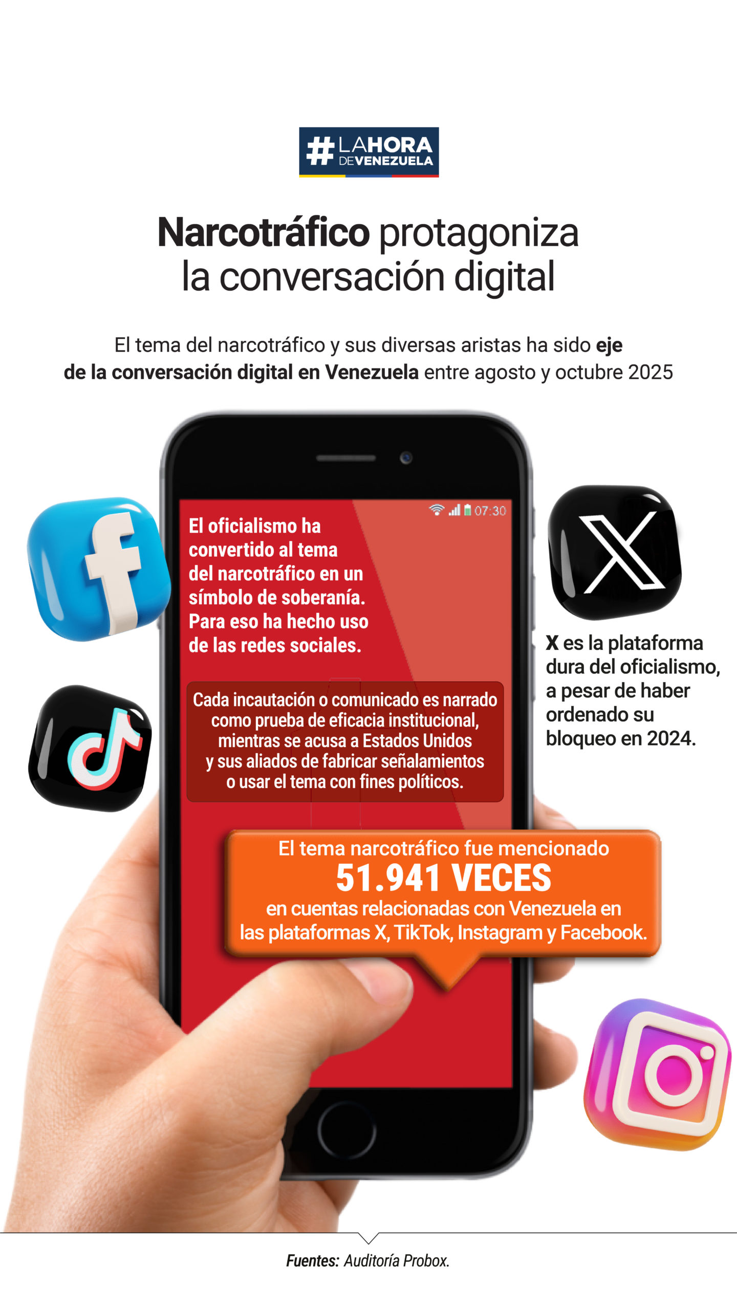La coincidencia temporal de estos anuncios, concentrados entre agosto y noviembre, sugiere un uso estratégico de los datos. Un análisis y seguimiento de #LaHoradeVenezuela a los discursos oficiales de Caracas y Washington, muestra que ambos gobiernos intensificaron su comunicación antidrogas justo cuando las tensiones diplomáticas alcanzaban su punto más alto y el tema migratorio se mezclaba con acusaciones de terrorismo.