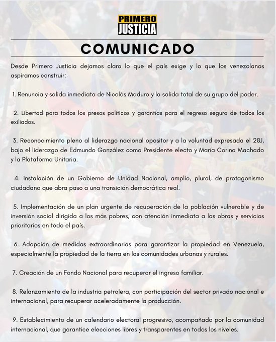 Primero Justicia publicó un comunicado de nueve puntos en el que plantea entre otras cosas, la renuncia de Nicolás Maduro y sus funcionarios, la libertad de todos los presos políticos y el reconocimiento a la voluntad popular expresada el 28 de julio.
