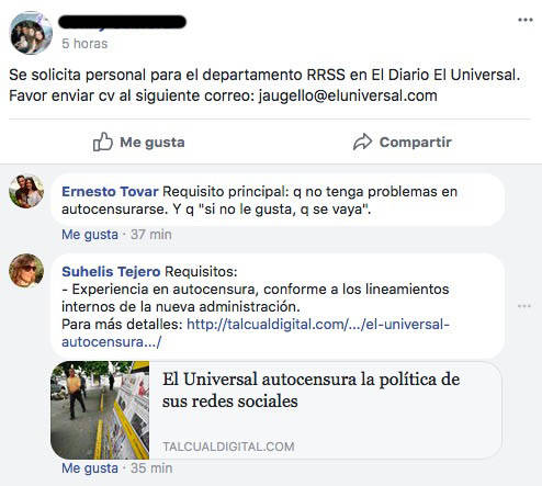 En la escalada de la #censura, @ElUniversal prohíbe la publicación de informaciones de naturaleza política en sus redes sociales. La medida anunciada en este memo ha generado el descontento y la renuncia de un grupo de trabajadores #30Ene pic.twitter.com/PUDsJf17OU