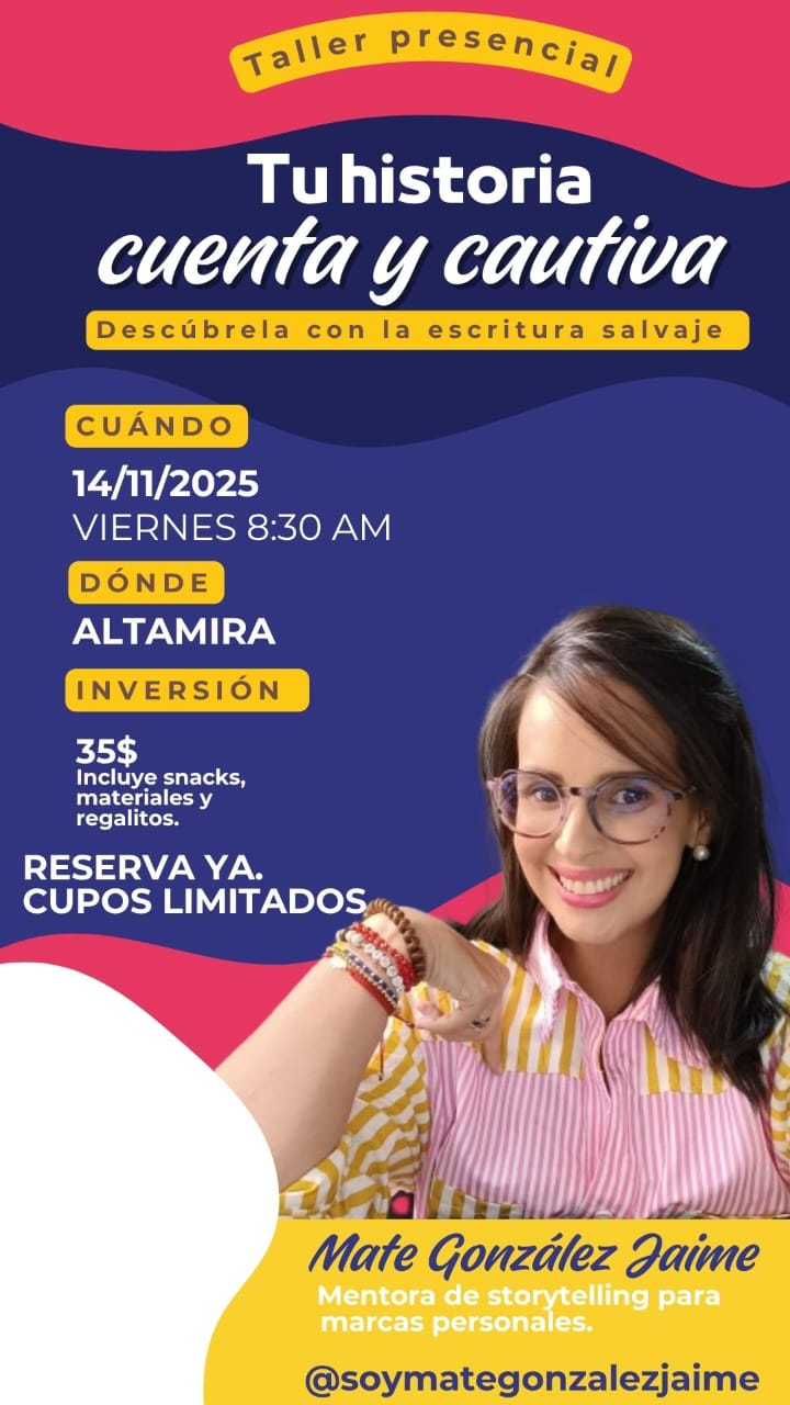 Detrás de este taller está Mate González Jaime: periodista egresada de la UCAB, creadora de Cuenta y Cautiva, escritora salvaje y profesora apasionada. Su trabajo combina estrategia, emoción y narrativa para ayudar a mujeres a encontrar su voz y contarla con poder. Mate no solo enseña a escribir; enseña a reconocerse, a nombrarse, a cautivar desde lo real. Su estilo mezcla estructura con magia, claridad con corazón, y cada encuentro que facilita es una invitación a volver a casa… a través de las palabras.