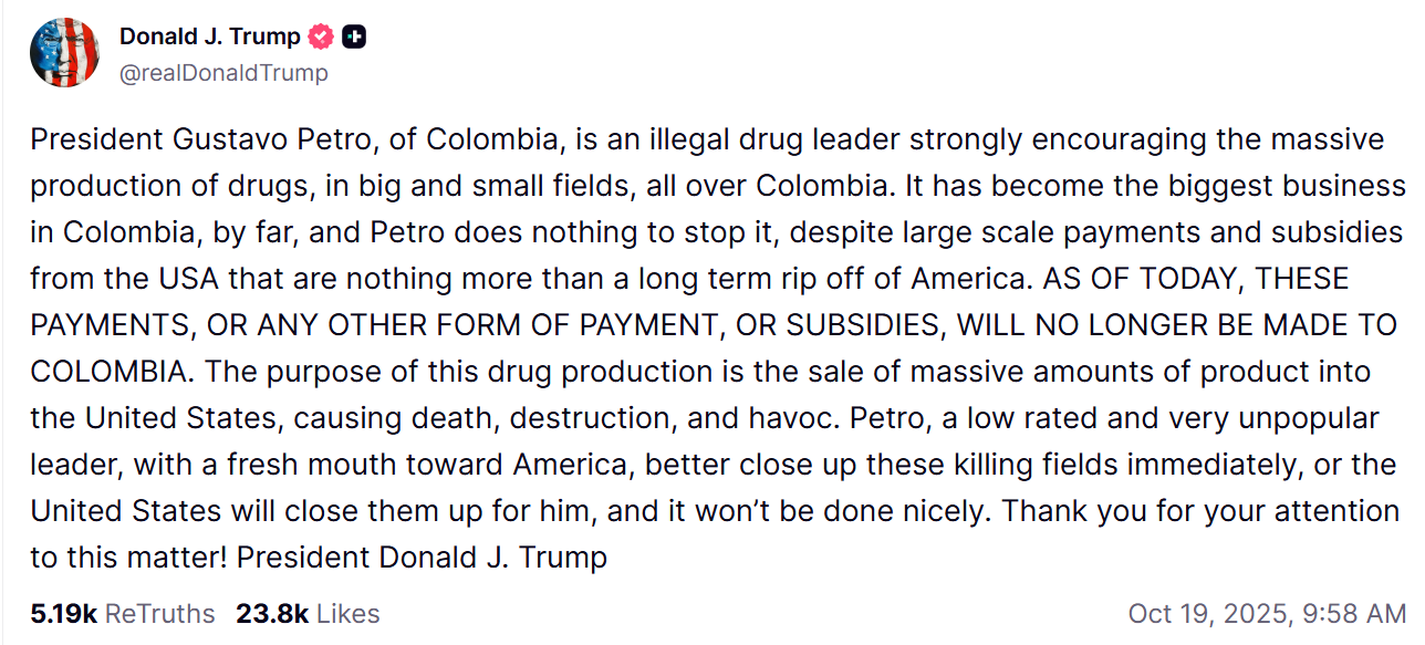 El presidente de Estados Unidos (EEUU), Donald Trump, acusó este domingo 19 de octubre a su homólogo de Colombia, Gustavo Petro, de tolerar la producción de drogas y anunció que pondrá fin a los «pagos y subsidios a gran escala» al país sudamericano.