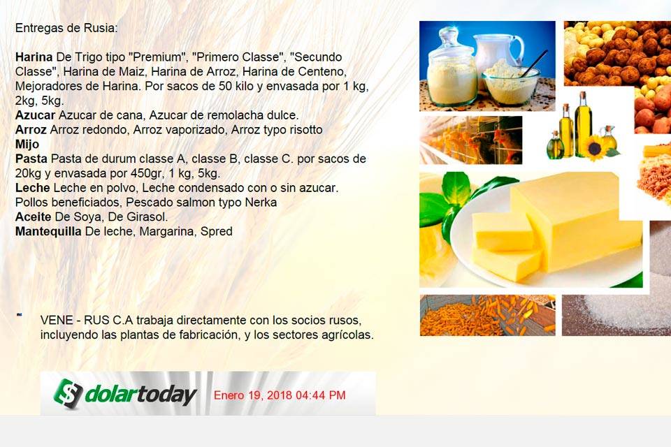 Entre sus productos están pasta, harina de maíz -¿los rusos comen arepas?- harina de trigo, azúcar de “cana” -¿será cubana?, y también de remolacha. Leche, aceite –de soya y girasol- y también mantequilla. Productos todos escasos en los abastos y mercados venezolanos.